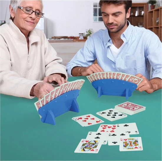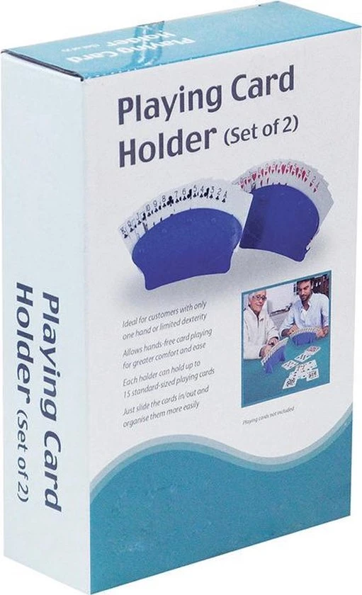 Dit paar speelkaarten houders is ideaal voor hands-free kaarten. Plaats in elke houder tot wel 15 kaarten om ze zonder handen overzichtelijk te zien en te organiseren. De kaarten glijden gemakkelijk in en uit de houder. De kaarthouder kan staan, liggen of eenvoudig in één hand worden gehouden. De onderzijde van de houder is glad en voorkomt krassen op tafels. Een ideaal formaat houder voor bijvoorbeeld poker, pesten, klaverjassen of andere kaartspellen. Heeft u beperkte beweeglijkheid, handklachten of één hand, dan is dit een ideale oplossing. Hierdoor kunnen gebruikers genieten van dit leuke tijdverdrijf met comfort, gemak en een grotere onafhankelijkheid. Let op: speelkaarten niet meegeleverd.
