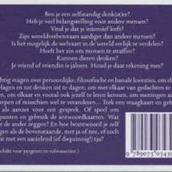 BILLEN BLOOT SPEL. Een spel met vragen rond politieke meningen, persoonlijke keuzes en banale dagelijkse praktijk: Ben je een zelfstandig denk(st)er? Heb je veel belangstelling voor andere mensen? Vind je dat je intensief leeft? Zijn wereldverbeteraars aardiger dan andere mensen? Is het mogelijk de welvaart in de wereld eerlijk te verdelen? Heeft het zin om mensen te straffen? Kunnen dieren denken? Je vriend of vriendin is jaloers. Houd je daar rekening mee? Tachtig vragen over persoonlijke, filosofische en banale kwesties, om elkaar te plagen en tot denken uit te dagen, om met elkaar van gedachten te wisselen, om elkaar en vooral ook jezelf te leren kennen, om meningen aan te scherpen of misschien wel te veranderen… Trek een vraagkaart en gebruik die als aanzet voor een gesprek. Of speel om de punten en gebruik de antwoordkaarten. Wat gaat de ander zeggen? En hoe beantwoord je zelf vragen als de bovenstaande, met ja of nee, of toch maar met een aarzelend (of diepzinnig!) tja? Doosje 9×12 cm, 80 vraagkaarten, plus 6 blanco kaarten voor eigen vragen, 22 antwoordkaarten (‘ja’, ‘nee’, ’tja’ en ‘elk antwoord is goed’) en 2 kaarten met uitleg van speelmogelijkheden.