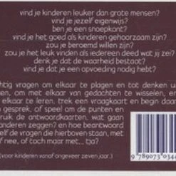 BILLETJES BLOOT SPEL. Spannende, slome en filosofische vragen, geschikt voor kritische kinderen en andere mensen: Vind je jezelf eerlijk? Denk je dat koeien kunnen denken? Vind je dat je een opvoeding nodig hebt? Zou je beroemd willen zijn? Denk je dat de waarheid bestaat? Ben je een snoepkont? Schaam je je als je een wind laat? De vragen worden veel gebruikt in het basisonderwijs, maar ook thuis. Het spel is op verschillende manieren te gebruiken: alleen de vraagkaarten, of met antwoordkaarten erbij (‘ja’, ‘nee’, ’tja’ en ‘elk antwoord is goed’). Doosje 9×12 cm, 80 vraagkaarten, plus 6 blanco kaarten voor eigen vragen, 22 antwoordkaarten en 2 kaarten met uitleg van de speelmogelijkheden.