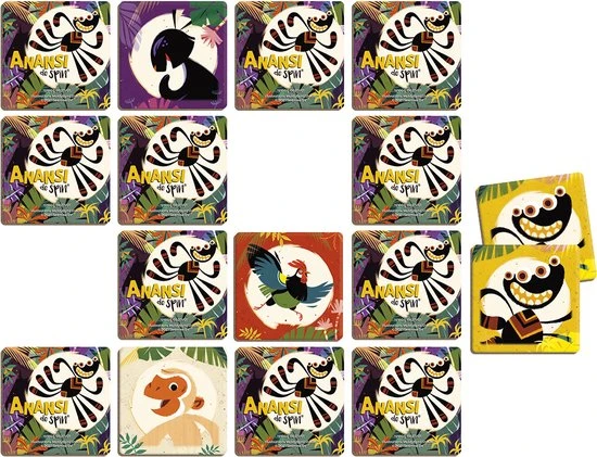 Memo is bij iedereen bekend en kinderen zijn er helemaal dol op. Voor dit memospel zijn afbeeldingen gebruikt uit de serie Anansi de spin en dat maakt het voor kinderen heel herkenbaar en extra leuk. Anansi zegt vaak: Wie niet sterk of groot is, moet slim zijn! Dus ga snel op zoek naar de dubbele kaartjes van Anansi en zijn vrienden, Schildpad, Konijn, Aap, Krekel en Haan. Dit memospel bevat 40 kaartjes van zeer stevig karton. Voor kleinere kinderen is het verstandig eerst met een beperkt aantal kaartjes te beginnen.
