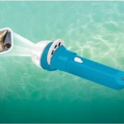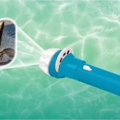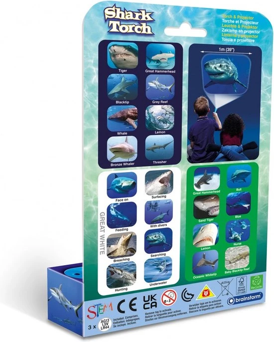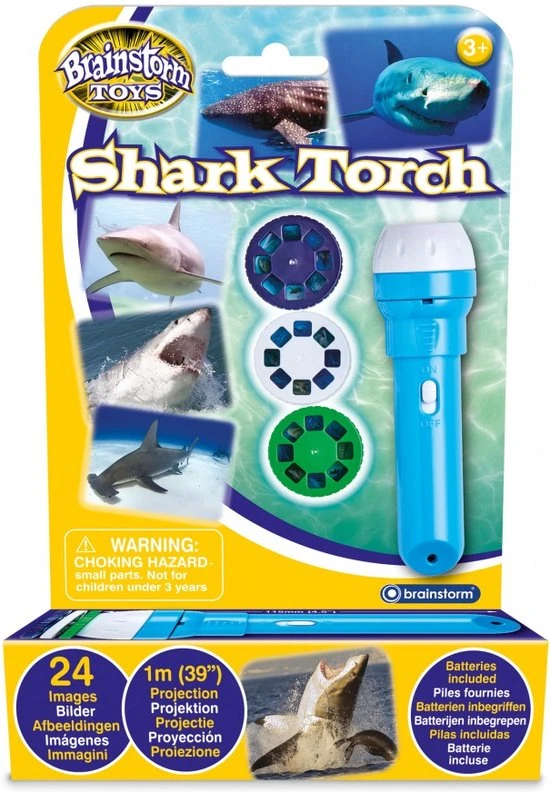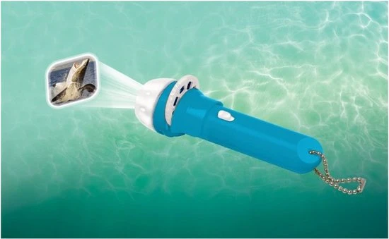 De zaklamp wordt geleverd met drie schijven met in totaal 24 kleuren haaien afbeeldingen.