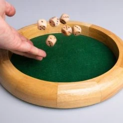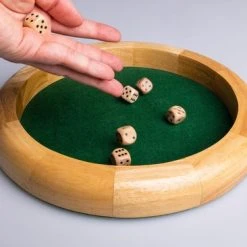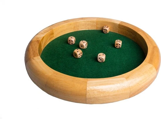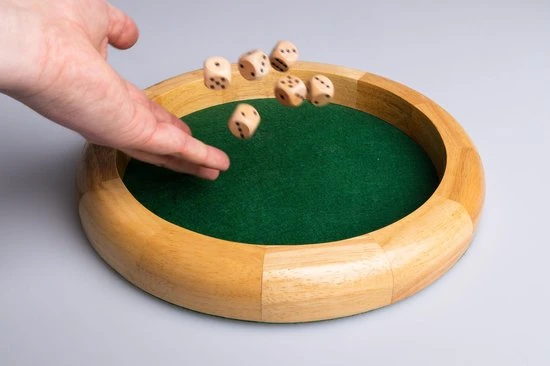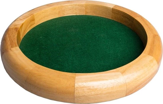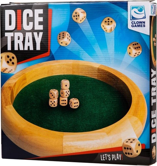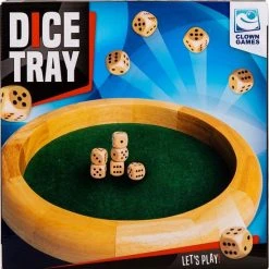 Clown Games dobbelbak van hout. Rollen bij jullie thuis ook altijd de dobbelstenen van tafel? Gebruik dan deze handige dobbelbak, inclusief dobbelstenen! Hiermee kun je allerlei leuke dobbelspellen spelen. Inhoud: ronde dobbelbak van hout met een vilten onderlaag en 6 dobbelstenen. Diameter: 30 cm. Wordt geleverd in full-colour doos. Geschikt voor zowel kinderen als volwassenen: 1 of meer spelers vanaf 5 jaar.