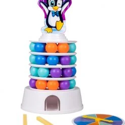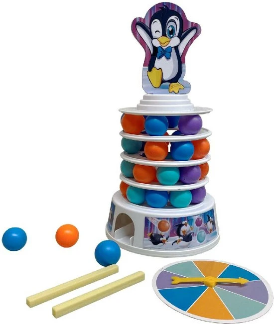 Clown Games wankele wiebeltoren. Plaats de balletjes op de basis en leg er een ring op. Zo bouw je een hoge toren. Nu ga je draaien aan de draaischijf. De kleur waarop ‘ie eindigt, geeft aan welke kleur het balletje moet hebben, dat je moet verwijderen. Dit doe je met behulp van een stokje: hiermee valt het balletje in de basis en komt hier weer uit rollen. Elk balletje dat verwijderd wordt, maakt de toren minder stabiel. De speler, die uiteindelijk de toren laat vallen, heeft verloren! Inhoud: 36 gekleurde balletjes, 1 basis, 2 stickers met pingu?n-illustraties, 4 ringen, 1 kartonnen pingu?n om bovenop te plaatsen, 2 stokjes, een draaischijf en instructies. Wordt geleverd in full-colour doos. Geschikt voor 2 spelers vanaf 5 jaar.