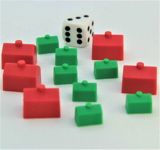 35 Groene Huisjes15 Rode Hotels2 echte dobbelstenen (kunststof 5,2 gram per stuk)
