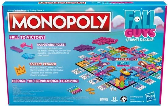 In this exciting edition of the Monopoly game, players buy up as many Rounds as they can. The more Rounds they own, the more Kudos they can collect. Players move around the board as a Fall Guys character token, performing wild actions such as jumping, grabbing, and falling to victory! Besides dodging the 3D obstacles, players collect valuable Crowns when passing Go, and roll the Knockout die to change gameplay. The Monopoly: Fall Guys Ultimate Knockout Edition game makes a fun birthday gift or holiday gift for players ages 8 and up. The Fall Guys mark, logo and characters are trademarks of Mediatonic Limited. © 2022 Devolver Digital Inc. The Hasbro, Hasbro Gaming, Parker Brothers, and Monopoly names and logos, the distinctive design of the gameboard, the four corner squares, the Mr. Monopoly name and character, as well as each of the distinctive elements of the board and playing pieces are trademarks of Hasbro for its property trading game and game equipment.