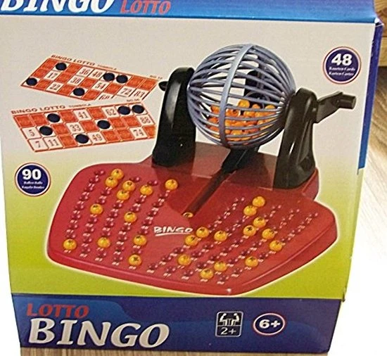 | Verpakkingsinhoud | Bingomolen, met, 90, balletjes, 48, bingokaarten, en, fiches |