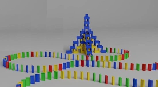 Een andere manier van spelen met de dominostenen is om ze achter elkaar rechtop neerzetten. Als er dan 1 steen omvalt, zorgt deze dat de volgende omvalt, die op zijn beurt weer de volgende aantikt, enzovoorts. Dit heet het domino-effect.