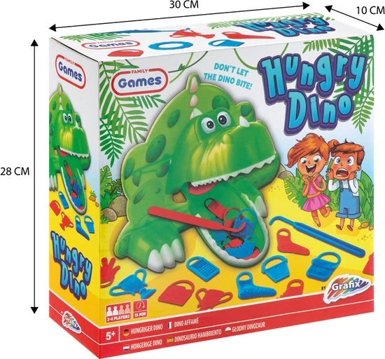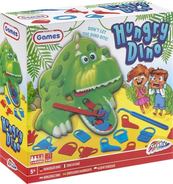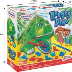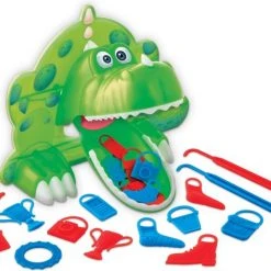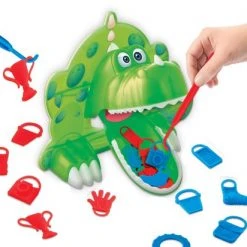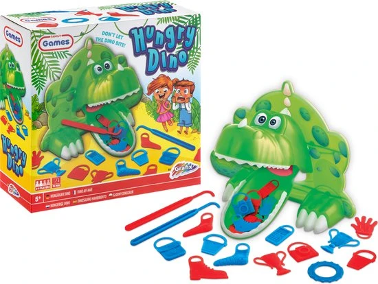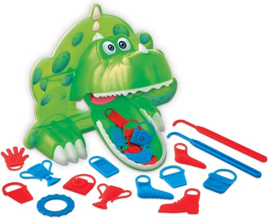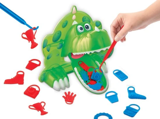 Leg alle objecten in de bek van de dino. De spelers halen er om de beurt een object uit met de haak. Doe voorzichtig, raak de tanden niet aan. Als de dino zijn bek sluit verlies je het spel!