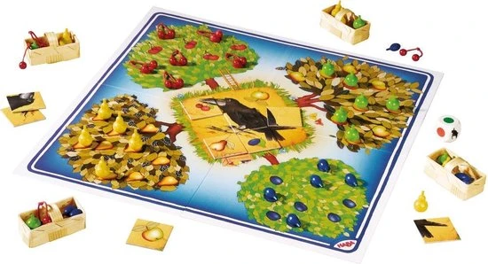 In de boomgaard hangen de bomen vol vruchten, maar de guitige raaf wil alles jatten. De kinderen proberen het fruit sneller te oogsten dan de raaf. Afhankelijk van het symbool op de dobbelsteen mogen de spelers ofwel één of twee vruchten van een boom plukken en in hun eigen mand leggen, ofwel een stukje van de ravenpuzzel in het midden van het spelbord leggen. Als de kinderen alle fruit oogsten vóór de ravenpuzzel volledig is, winnen ze.