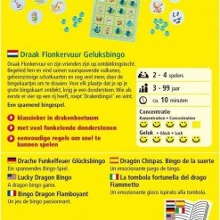 Speel samen met draak ‘Flonkervuur’ en ??en zijn vrienden gaan de spelers op ontdekkingstocht om bij het omdraaien van de bingokaartjes vuurspuwende vulkanen, geheimzinnige schatkaarten en nog veel meer te ontdekken. Voor elk plaatje dat ze op hun grote bingokaart vinden, krijgen ze een dondersteen. Wie als eerste vier op een rij heeft, roept ‘Drakenbingo!’ in wint.