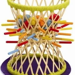 Het spel Pallina bestaat uit een grote houten korf van 24 x 24 x 32 cm, 20 bamboe staafjes en 16 houten balletjes in 4 verschillende kleuren, een basis en een handleiding.