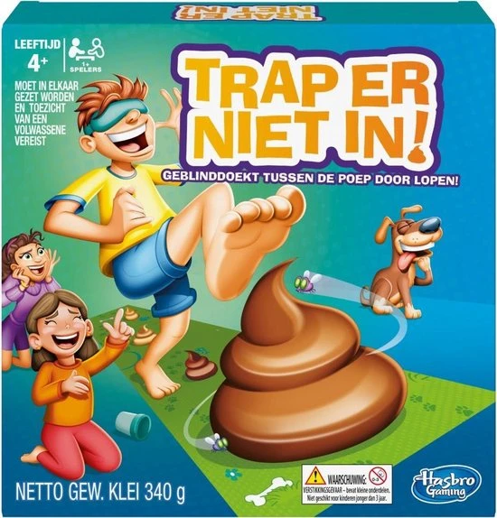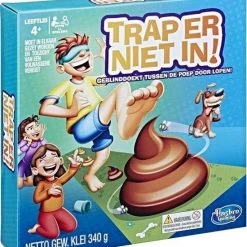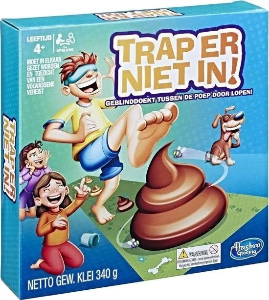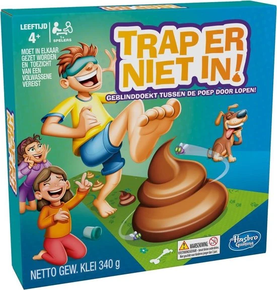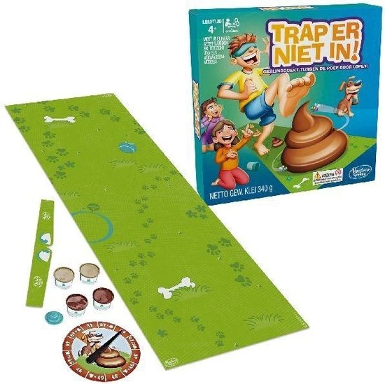 Trap er niet in als je dit hilarische spel met vieze gevolgen speelt! Doe een blinddoek om, laat de draaiwijzer draaien en loop zoveel stappen over de spelmat. Maar kijk uit, want er liggen bergjes bruine klei (in de vorm van drollen) op de mat! Soms mogen de spelers drollen toevoegen, weghalen of anders neerleggen. Wie weet de meeste drollen te vermijden terwijl hij geblinddoekt tussen de poep door loopt?