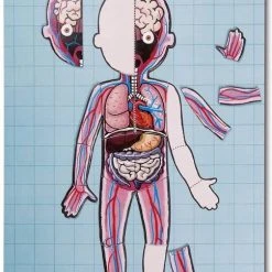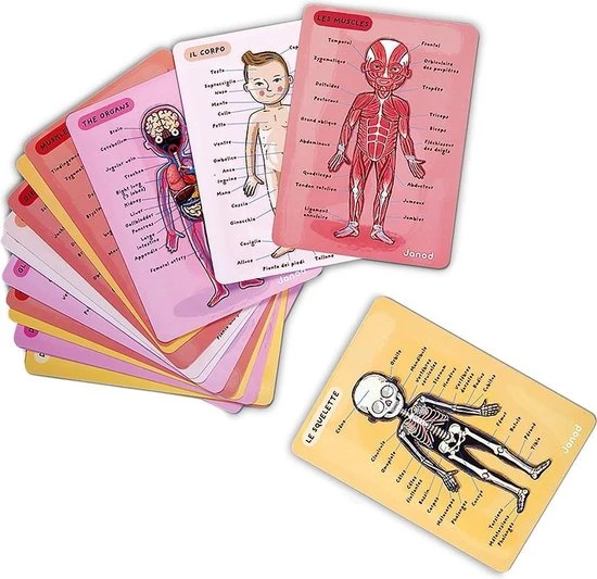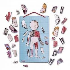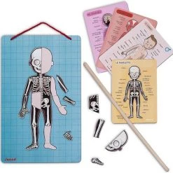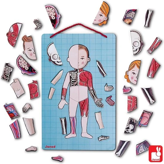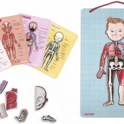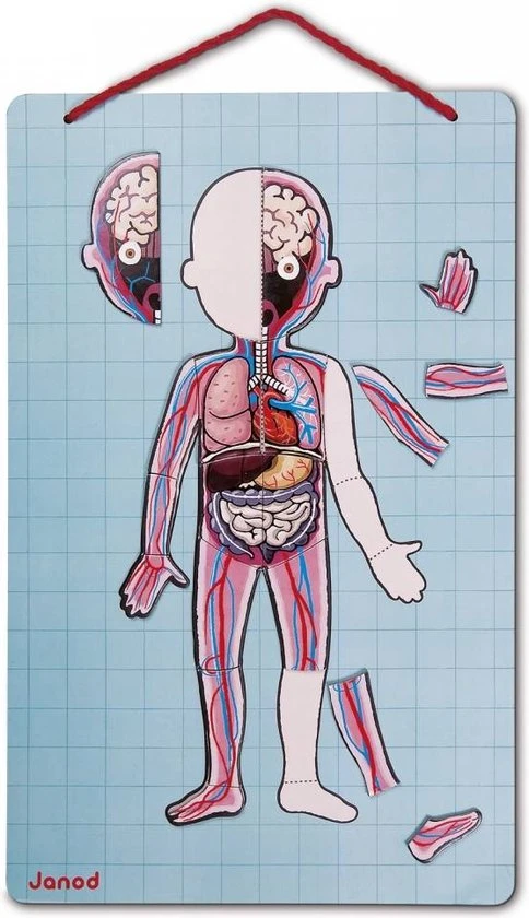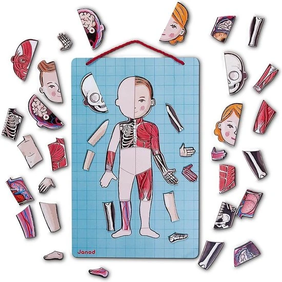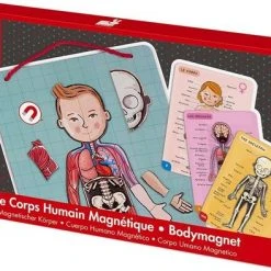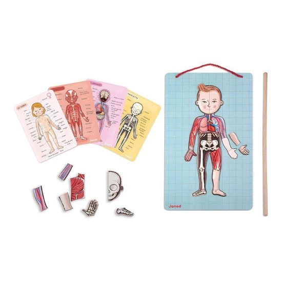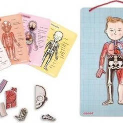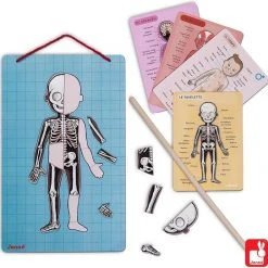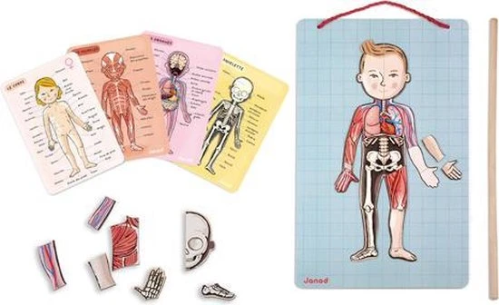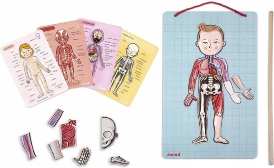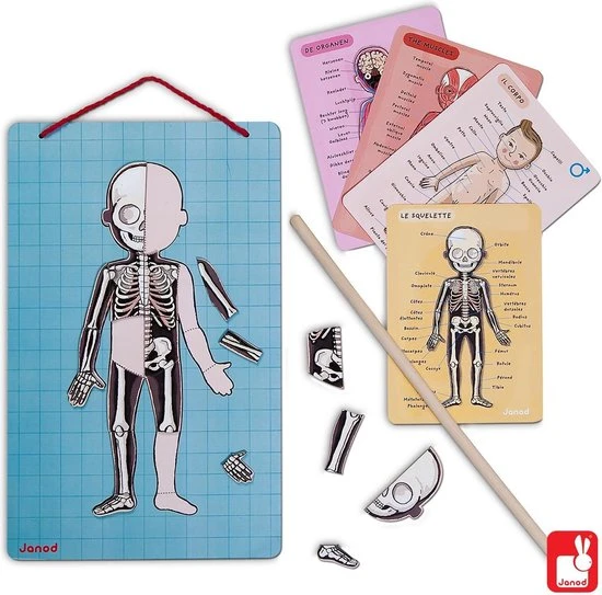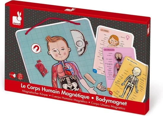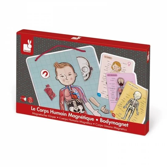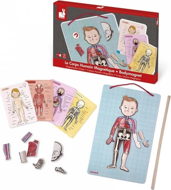 Een ludieke manier om de kinderen het menselijk lichaam te leren kennen is dit magneetspel van Janod! Bevat 76 magneten en een magneetbord waarop je de verschillende onderdelen van het menselijk lichaam moet gaan assembleren op de juiste plaats. Dit spel bevat 4 getedaillerde kaarten over het skelet, de organen, de spieren en het lichaam. De kaarten zijn maar liefst vertaald in 12 talen: frans, engels, duits, nederlands, russisch, spaans, catalaans, baskisch, italiaans, deens, japans en chinees. Je kan dus nog een stap verder gaan wat het leren betreft!