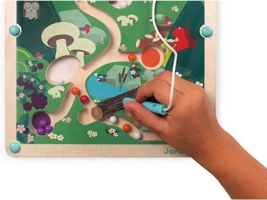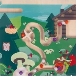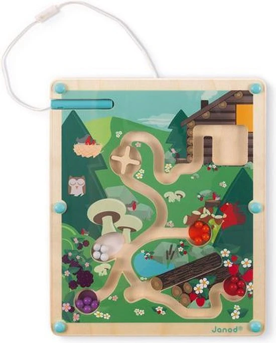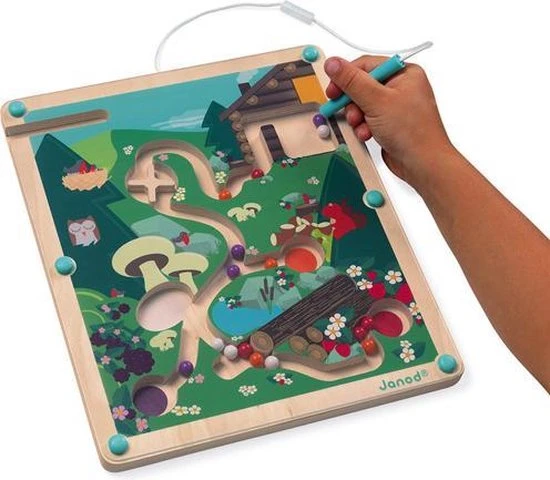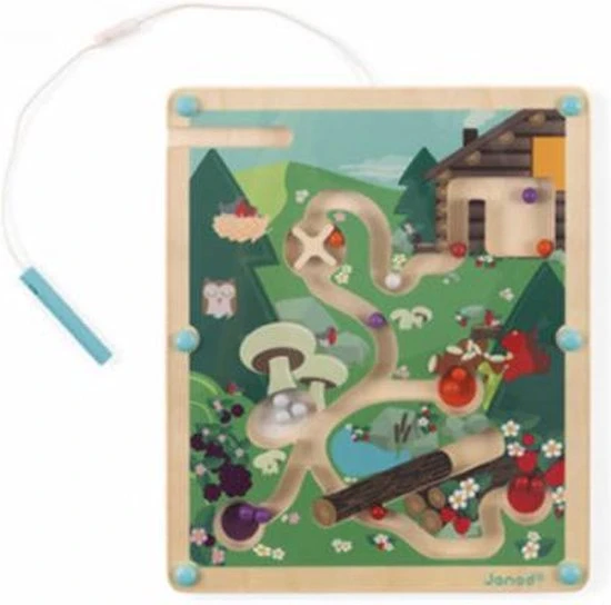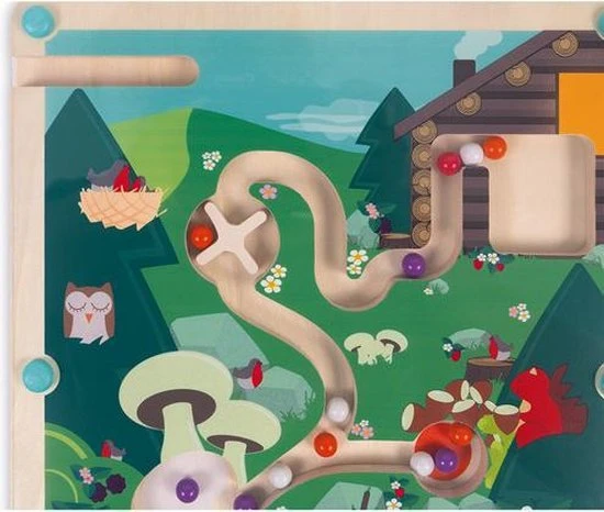 Knikkerdoolhof woud. Houten speelgoed. Voor kinderen tussen 2 en 5 jaar. Ga vanaf het chalet door het doolhof en reng de 16 gekleurde knikkers naar hun overeenkomstige zone met behulp van de mageneetpen. Rood voor de bosaardbeien, paars voor de moerbeiene etc. Neem het draaihek echter goed en schuif de magnetische boomstam zodat je niet vast komt te zitten!
