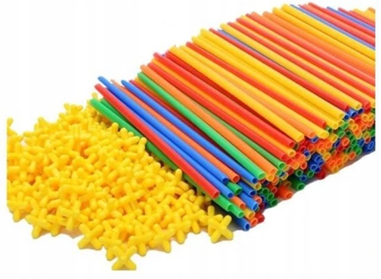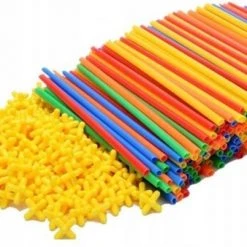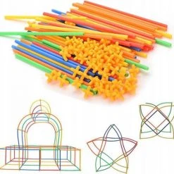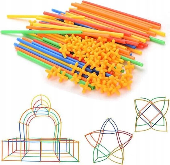De rietjes zijn verkrijgbaar in 5 kleuren: rood, oranje, blauw, groen, geel, waardoor je ruimtelijke vormen kunt cre?ren die niet alleen de vorm maar ook de kleuren inspireren. Het pakket bevat ook voorbeeldvisualisaties van projecten die met blokken kunnen worden uitgevoerd.