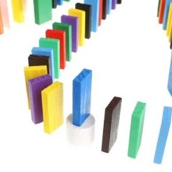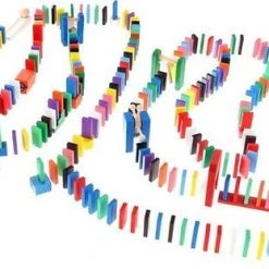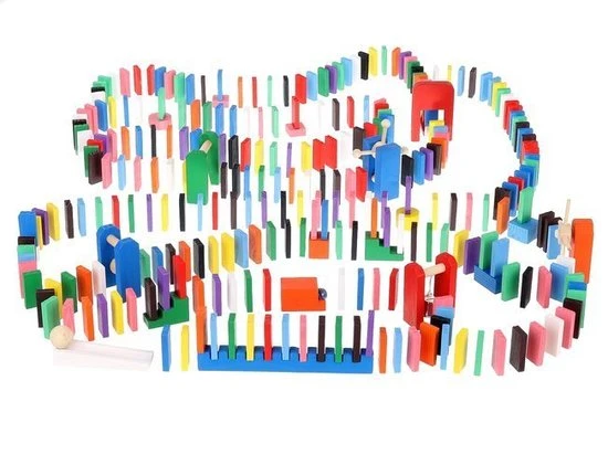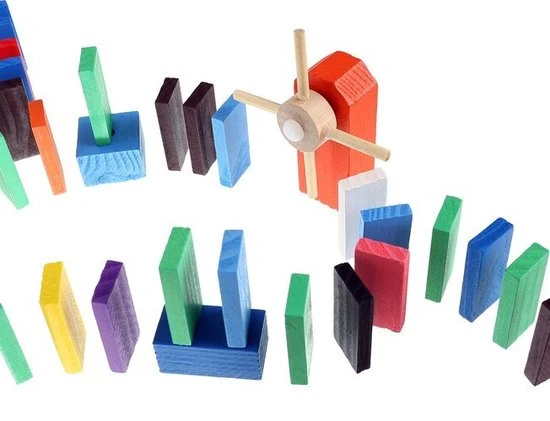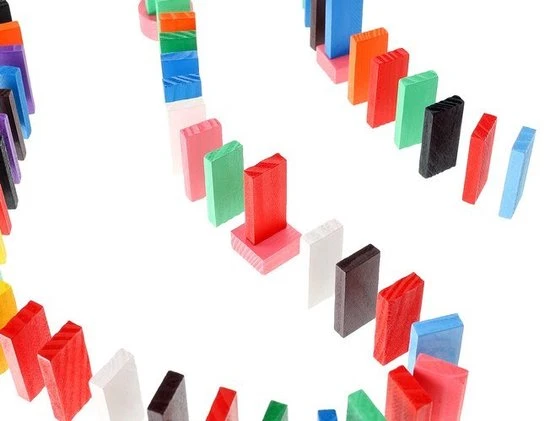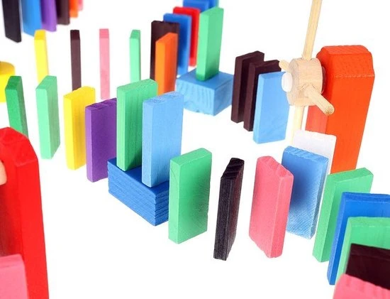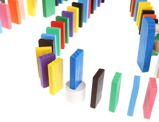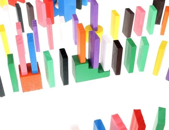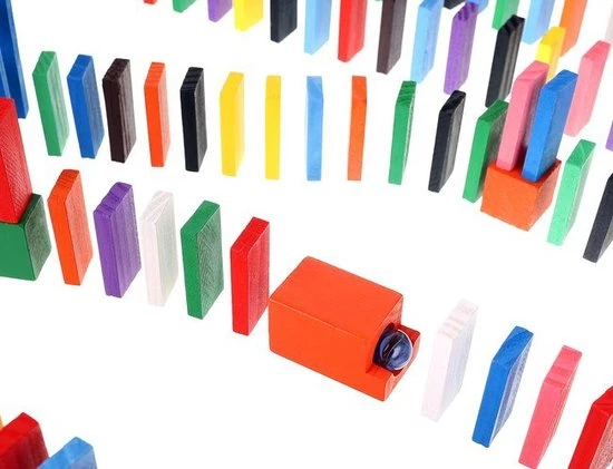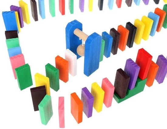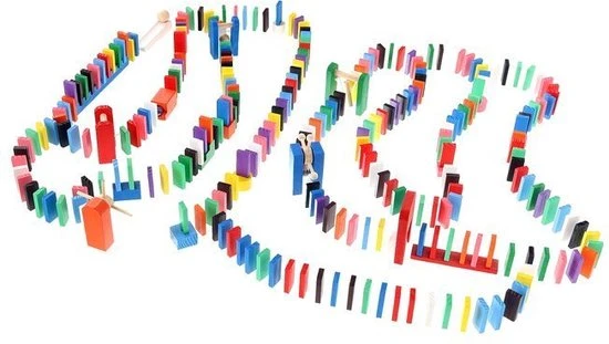 De dominostenen worden achter elkaar rechtop gezet. Als er dan 1 steen omvalt, zorgt deze dat de volgende omvalt, die op zijn beurt weer de volgende aantikt, enzovoorts. Dit heet het domino-effect.