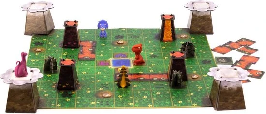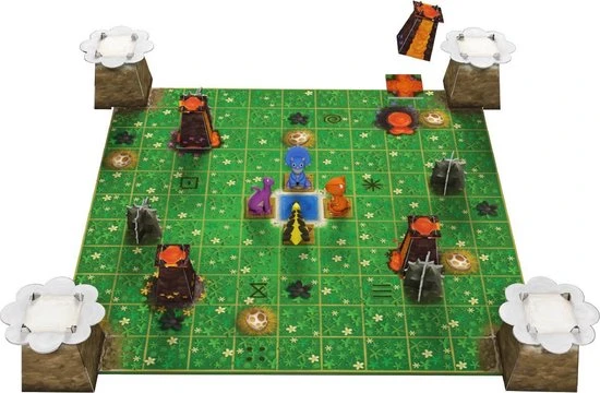 Trek een tegel, plaats deze op het speelbord en verschuif vervolgens één van de Dino’s dichter naar de veilige bergen. Pas op voor de lava en meteorenregen!