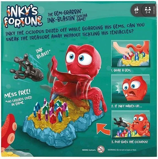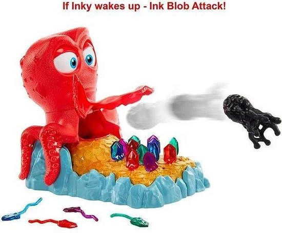 Kinderen kunnen om de beurt edelstenen van Inky, de slapende octopus, proberen te sluipen. Hij ziet er misschien uit alsof hij dommelt, maar probeer zijn schatten te ruw aan te pakken en hij zal in actie komen. Je wilt niet dat hij zijn inktvlek afschiet! Als de speler erin slaagt de edelsteen er stilletjes uit te trekken, kan hij deze vasthouden. Elke edelsteen is anders, dus ze zullen geduldig en bekwaam moeten zijn! De speler met de meeste edelstenen wanneer alle schatten zijn verzameld, wint het spel. Geschikt voor kinderen van 6 jaar en ouder Leeftijdsbereik: 5 + Waarschuwingsbericht: Waarschuwing: niet geschikt voor kinderen jonger dan 3 jaar