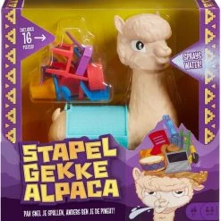Stapelgekke Alpaca is een grappig kinderspel met tal van spelstukken en 1 spuuggrage alpaca! Je speelt dit spel door om de beurt een spelstuk op de rug van Al de alpaca te leggen. Maar let op de tijd, want deze alpaca is zeer opvliegend! Begin van het spel: draai het hoofd van Al naar de speler die begint en start de tijd. Je hebt 5 seconden de tijd om een spelstuk op zijn rug te leggen. Als dit niet lukt binnen de tijd, SPUUGT Al water naar je! Je vaardigheden en behendigheid worden op de proef gesteld bij het opstapelen van de spelstukken. Hoe meer spelstukken er op de rug van Al liggen, hoe uitdagender het spel wordt. Als je er andere spelstukken af laat vallen, moet je ze aan je eigen voorraad toevoegen. De speler die als eerste al zijn spelstukken kwijt is, is de winnaar. Lukt het jou om dit voor elkaar te krijgen voordat Al zijn geduld verliest? Dit leuke, grappige kinderspel is geschikt voor 2 tot 4 spelers en is ideaal voor kinderen van 5 jaar en ouder. Inhoud: 1 spugende alpaca en 16 kleurrijke spelstukken. Afwijkende kleuren en versieringen mogelijk.
