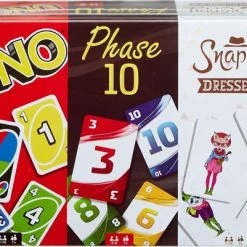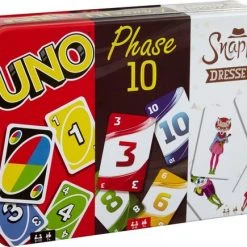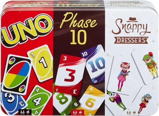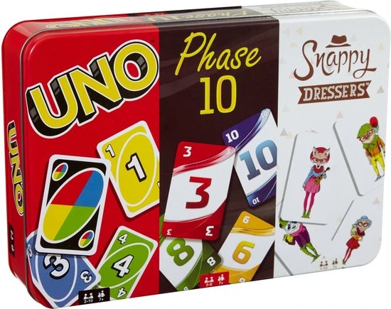 Wat een geweldig cadeau voor vrienden die van spelletjes houden: UNO, PHASE 10 en SNAPPY DRESSERS in één premium luxe uitvoering! Welk spel gaan ze het eerst spelen? UNO: Vind dezelfde kleuren en getallen en zorg dat je als eerste speler al je kaarten kwijtraakt. PHASE 10: Spelers moeten hun kaarten gewiekst spelen om alle 10 fasen van het spel uit te spelen. SNAPPY DRESSERS: eindeloos creatief kaartspel waarbij elke kaart op maar één manier past bij een andere kaart in het spel. De ultieme kaartspelverzameling voor vrolijke avonden thuis met familie en vrienden. Nodig je vrienden uit en speel ze alle drie!