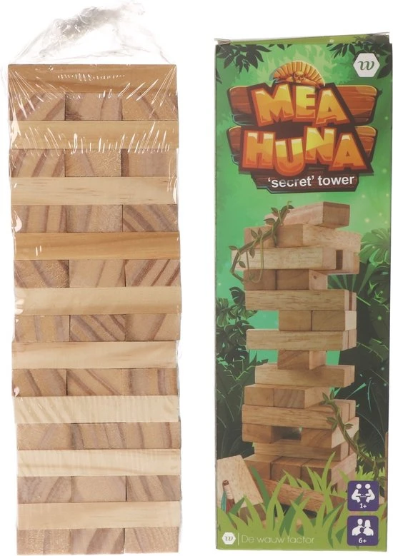 Test hoe vast jouw hand is met Jenga Mea huna houten toren spel. Spanning, strategie en inzicht zijn nodig om de toren niet in jouw beurt te laten vallen! Bouw de toren. Leg drie blokken per laag, elke volgende laag haaks op de vorige. Gebruik zo nodig de stapelhoes. Haal met ??n hand een blok uit de toren, op een willekeurig plek onder de bovenste complete laag. Je mag de blokken aanraken om een losse te vinden. Leg het blok bovenop de toren. Wacht ongeveer 10 seconden. Als de toren instort, ben je af. Als de toren blijft staan, is de volgende speler aan de beurt. Als je in je eentje speelt, probeer je je eigen hoogste toren te verslaan. Zorg dat jij de laatste speler bent die een blok stapelt zonder dat de toren instort!