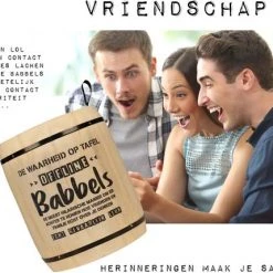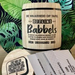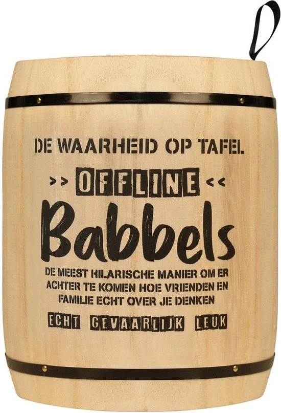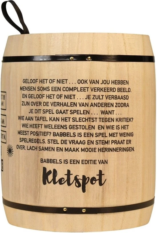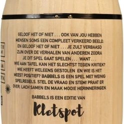 Omschrijving Kletspot Offline Babbels De waarheid op tafel met de Kletspot Offline Babbels! Een geschikte bezigheid om samen met de familie, vrienden of collega’s te doen. Pas op dat je tijdens het spelen niet valt van je stoel, ten gevolge van de hilarische antwoorden van jouw medespelers. De Kletspot Offline Babbels heeft 200 vragen en heeft weinig spelregels en zorgt voor hilarische momenten. Verwen daarom jezelf of een speciaal iemand met dit spel. Eigenschappen * Kleuren: Verschillende tinten bruin