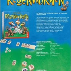 Dit snelle compacte dobbelspelletje Regenwormen kun je op elk moment en overal spelen. Het duurt niet langer dan een half uurtje en het formaat zorgt ervoor dat je het thuis, in de trein of op de campingtafel kunt neerleggen. Iedereen die tot 36 kan tellen, kan meedoen! Als je aan de beurt bent, gooi je met 8 dobbelstenen. Je legt nu alle dobbelstenen met hetzelfde getal of met een worm opzij. Daarna gooi je met de resterende dobbelstenen en legt nu alle dobbelstenen met een ander getal opzij. Als je totaal hoger is dan 20 en je hebt ten minste ??n worm gegooid, mag je de steen met het betreffende getal van tafel of zelfs van een andere speler pakken! Maar neem je teveel risico en gooi je alleen maar getallen die je al eens hebt gepakt, dan ben je af en moet je juist een steen inleveren. Op elke steen staan een aantal regenwormen. Wie aan het einde van het spel de meeste regenwormen heeft, is de winnaar. Probeer Regenwormen nu zelf uit met onze online probeervariant.