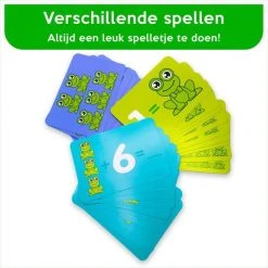 De moeilijkste spelvorm is gericht op het ontwikkelen van de rekenvaardigheden. Op de kaartjes staan rekensommetjes die opgelost moeten worden. Leg de bijbehorende getallen en kikkertjes op de weegschaal om de weegschaal in balans te brengen.