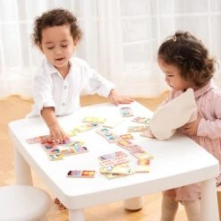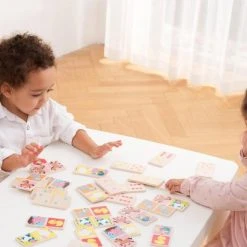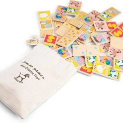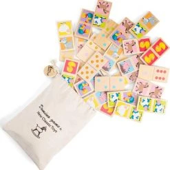 Spelregels: leg alle dominostenen met de afbeelding naar beneden op tafel en meng ze door elkaar. Elke speler neemt 6 dominostenen, als er meer dan 3 spelers zijn, mag elke speler er maar 3 nemen. Laat de andere spelers je dominostenen niet zien! Spelers wisselen elkaar af om de dominostukken te matchen met de juiste aantal stippen en de afbeelding. De winnaar is de eerste speler die al zijn dominostenen kwijt is. Wordt geleverd met een katoenen tas voor eenvoudig opbergen. Dit dominospel is gemaakt van FSC® 100% -gecertificeerd hout.