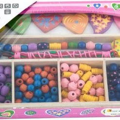 Maak zelf je eigen persoonlijke ketting of armband. In deze mooie houten doos zitten 180 verschillende houten kralen, acht verschillende vormen en vijf koorden. Deze houten rijgkralen set helpt kinderen vormen en kleuren te herkennen en stimuleert de hand-oog co?rdinatie.