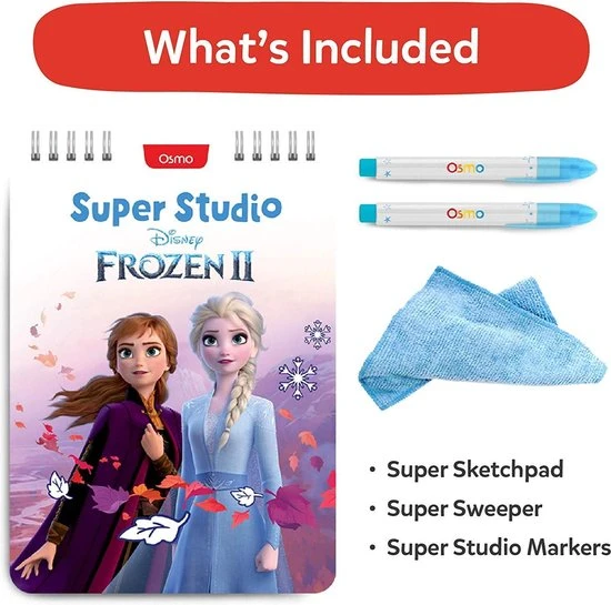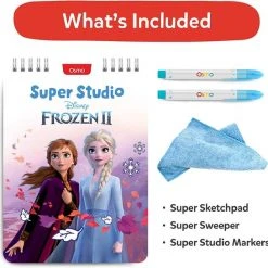 Super Sketchpad (speciaal tekenblok), Super Studio stiften (2), Super schoonmaakdoekje & 1 spelletjes App: Super Studio Disney Frozen 2.