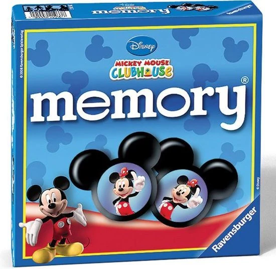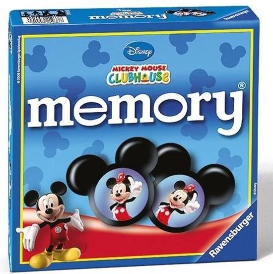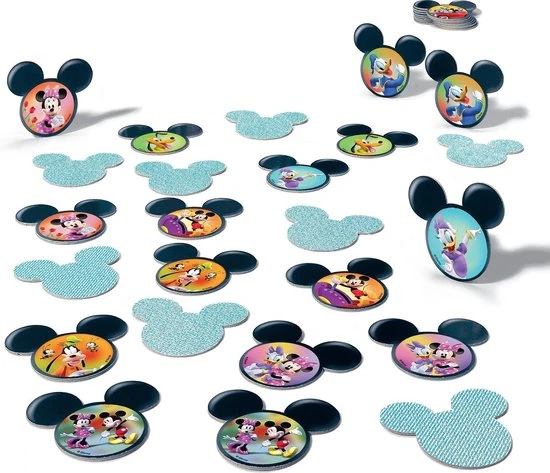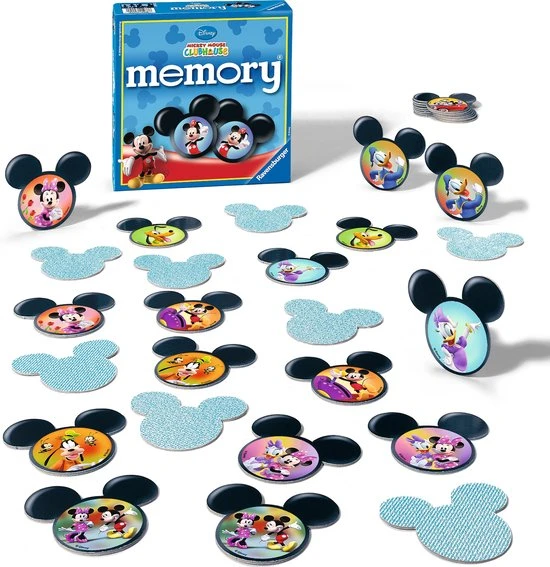 Een grappige memory? van Ravensburger met Mickey en zijn vriendjes. De kaarten zijn in de vorm van het hoofd van Disney Mickey Mouse.