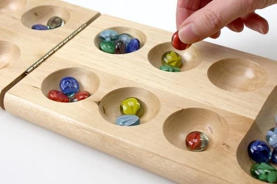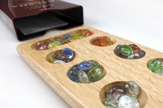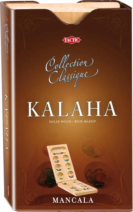Kalaha of Mancala is een klassiek spel van Afrikaanse herkomst, in een blikken doos.