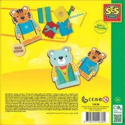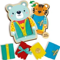 Brrr? deze dieren hebben het koud. Help jij ze met het aantrekken van een warme jas? Ontdek de vier verschillende sluitingen en zorg ervoor dat de dieren het weer warm krijgen. De set bevat een stevig houten aankleed-dier (twee-zijdig te gebruiken) en jasjes met een knoop-, strik-, houtje-touwtje- en ritssluiting.