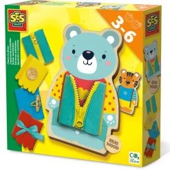 Brrr? deze dieren hebben het koud. Help jij ze met het aantrekken van een warme jas? Ontdek de vier verschillende sluitingen en zorg ervoor dat de dieren het weer warm krijgen. De set bevat een stevig houten aankleed-dier (twee-zijdig te gebruiken) en jasjes met een knoop-, strik-, houtje-touwtje- en ritssluiting.