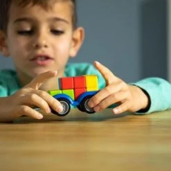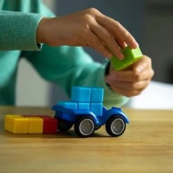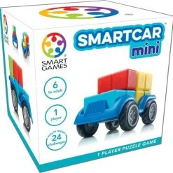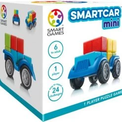 Kan jij een auto volgens plan in elkaar zetten? Plaats de 4 blokken op de juiste plaats en maak een testritje met je auto. SmartCar Mini is een leuke, compacte 3D-puzzel met 24 opdrachten. Spelregels Kies een opdracht en plaats alle blokken naast het chassis. Gebruik de 4 blokken om een auto te bouwen, waarbij de kleuren overeenkomen met de opdracht. Witte vierkantjes betekenen dat je de kleur van die puzzelstukken niet kent. Gebruikt deductie en logica om te ontdekken welke kleuren daar passen. Starter-opdrachten tonen een volledig zijaanzicht. Junior-opdrachten tonen een onvolledig zijaanzicht (met een aantal witte vierkantjes) Expert-opdrachten tonen een onvolledig voor-, zij- en bovenaanzich. Master-opdrachten tonen een onvolledig voor- en achteraanzicht. Er is maar 1 oplossing, die je in het boekje kan terugvinden. Inhoud: 1 auto met 4 wielen, 4 blokken in 4 verschillende kleuren, 1 boekje met 24 opdrachten.