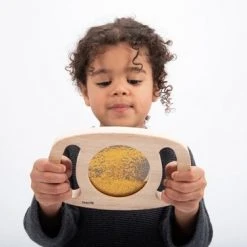 Een massief rubberhouten frame met gemakkelijke handgrepen en een paneel van gouden glitter. Draai het paneel om, om op fascinerende manieren de glitters te laten bewegen en stromen. Afmeting: 185 x 120 x 20 mm. Geschikt vanaf 12 maanden.