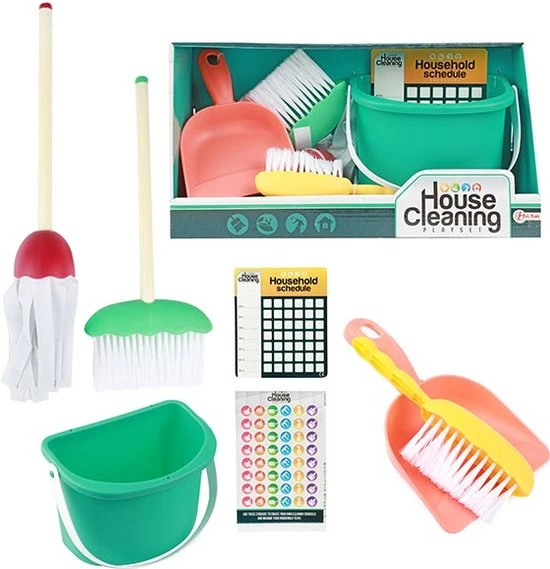 | Verpakkingsinhoud | 7, delige, set:, -emmer, -bezem, -stoffer, -blik, -dweil, -stickers, -schoonmaakschema |