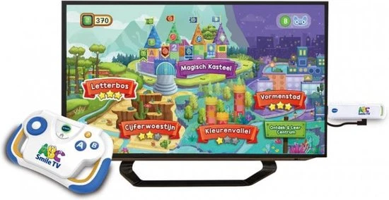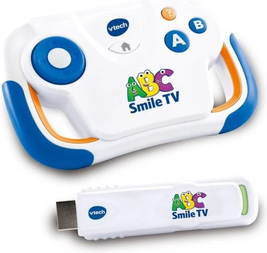 Plug & Play met ABC Smile TV! Ga mee op een vrolijk en leerzaam avontuur. Sluit de HDMI gamestick eenvoudig aan op de tv om te beginnen met spelen. Ga met de vrolijke karaktertjes op een leerzaam avontuur in het Ontdek & Leer Koninkrijk en maak tijdens het spelen kennis met letters, cijfers, kleuren, vormen, logica en nog veel meer! Verzamel onderweg edelstenen en pienterbessen ?n zoek de gestolen sleutels van het magisch kasteel! De draadloze controller is speciaal voor kleine handjes gemaakt en heeft stootvaste randen.