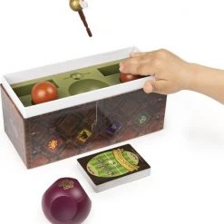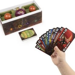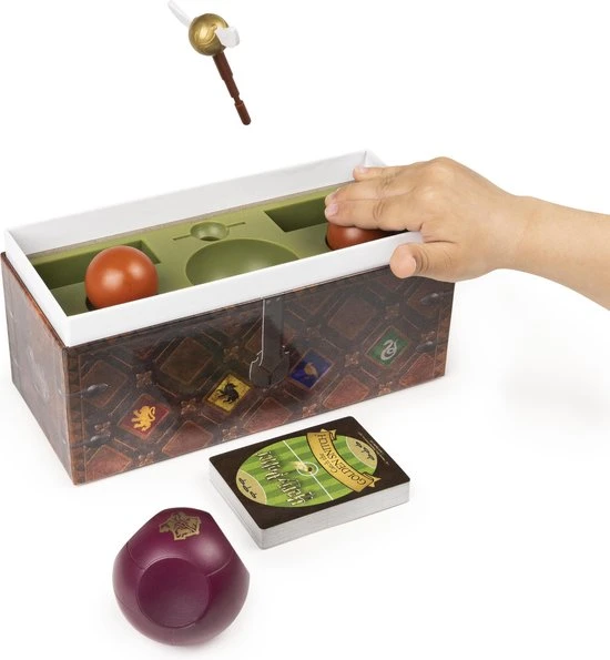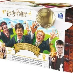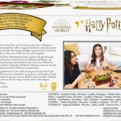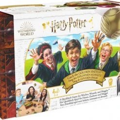 In het midden van de actie ligt een open Zwerkbalkist, met een Slurk, twee Beukers en het allerbelangrijkste, de Gouden Snaai. Wanneer je bepaalde kaarten neerlegt, komen deze magische items tevoorschijn om te spelen. Met een paar Chaser-kaarten kun je de set van een andere speler stelen, maar als je de Quaffle hebt verdiend, ben je veilig. Speel een paar Beuker-kaarten, pak een Beuker en gooi deze naar een speler naar keuze. Als ze de Beuker in de lucht meppen en een andere speler raken, moet die speler de kaarten in zijn hand afleggen. De actie gaat sneller dan een Nimbus 2000 als kaarten van hand wisselen, sets op tafel komen en Beukers hun doel bereiken. Wanneer de Gouden Snaai vanuit de kist de lucht in schiet, grijp hem dan – dat is extra punten waard. Het spel eindigt wanneer de Gouden Snaai gevangen wordt; de speler met de meeste punten wint. Voor snelle actie en opwinding speel je Vang De Gouden Snaai met je tovenaarsfamilie en vrienden. Voor leeftijden vanaf 8 jaar en voor 3 tot 4 spelers.